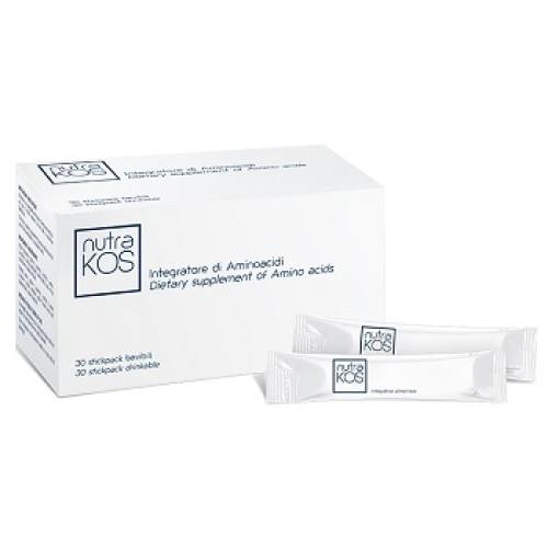 Integratore alimentare di aminoacidi. Lo specifico ed unico mix di aminoacidi presente in Nutrakos favorisce la sintesi di collagene ed elastina, che sono le proteine strutturali della matrice extracellulare (derma e tessuto connettivo in generale). L'uso giornaliero di Nutrakos in stick pack bevibili, stimolando la produzione di collagene ed elastina, promuove la rigenerazione dei tessuti.