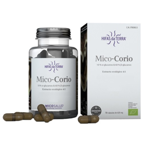 Integratore alimentare in capsule ad alta concentrazione, 100% puro estratto organico di Cordyceps sinensis e Reishi (Ganoderma lucidum), caratterizzato dall'alto contenuto di sostanze nutritive (come beta-glucani, triterpeni, ecc.). Ogni capsula è sigillata singolarmente con una fascia antiossidante che aiuta a preservare il contenuto in condizioni ottimali. La banda colorata personalizzata facilita la differenziazione di ciascun estratto durante il trattamento. L'inchiostro di ogni banda è di origine vegetale (carota, zucca, mela, ribes, ecc.). Mico-Corio PSK contiene vitamina B12 che contribuisce al normale funzionamento del sistema immunitario. Gli estratti presentano alte concentrazioni di principi attivi. Per la produzione di 1 kg di estratto di questi due funghi sono necessari 4 kg di polvere dei due funghi secchi e 40 kg dei due funghi freschi.
