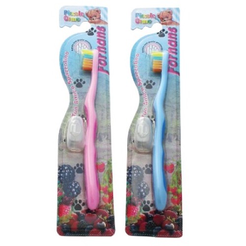 Spazzolino con testina dalle dimensioni ridotte, adatta ai bambini e studiata per permettere una pulizia efficace e completa dei denti. Disponibile nei colori rosa e azzurro.