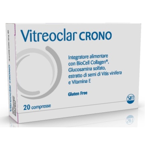 Vitreoclar Crono contiene tutte le sostanze utili per il trofismo dei tessuti connettivi: collagene di tipo II, acido ialuronico, condroitinsolfato e glucosamina.
