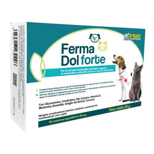 La presenza di glucosamina solfato e condroitin solfato, unitamente a specifici estratti botanici, fa di Petformance Ferma Dol Forte il prodotto ideale per il mantenimento delle normali caratteristiche fisiologiche della cartilagine articolare. La sua efficacia è basata sulla innovativa formulazione contenente principi naturali dalle riconosciute proprietà analgesiche ed antinfiammatorie, quali l'MSM (Metil Sulfonil Metano) ed estratti secchi quali la curcuma fitosomica (Meriva), la boswellia serrata (Casperome), l'artiglio del diavolo, l'ananas, il piper nigrum e l'olio di pesce. Particolarmente indicato in casi di artrite, displasia, problemi articolari e nel perseguimento della mobilità articolare post-traumatica. La speciale formulazione ha inoltre il vantaggio di non richiedere la contemporanea somministrazione di gastro protettori. Alta appetibilità.